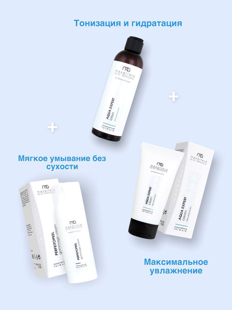Mesaltera by Dr. Mikhaylova Aqua Expert Kit - Набор Аква Эксперт от Мезалтера - Увлажнение для обезвоженной кожи (Gentle Cleanser Mousse - Универсальная пенка для умывания + Aqua Expert Крем + Aqua Expert Лосьон)